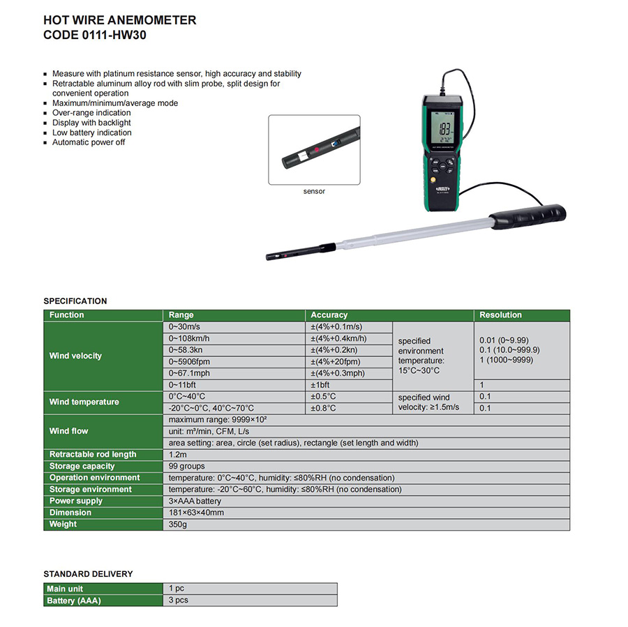 | 0111-HW30 | 0~5906fpm | ±(4%+20fpm) | 0.01, 0.1, 1 | Wind velocity |