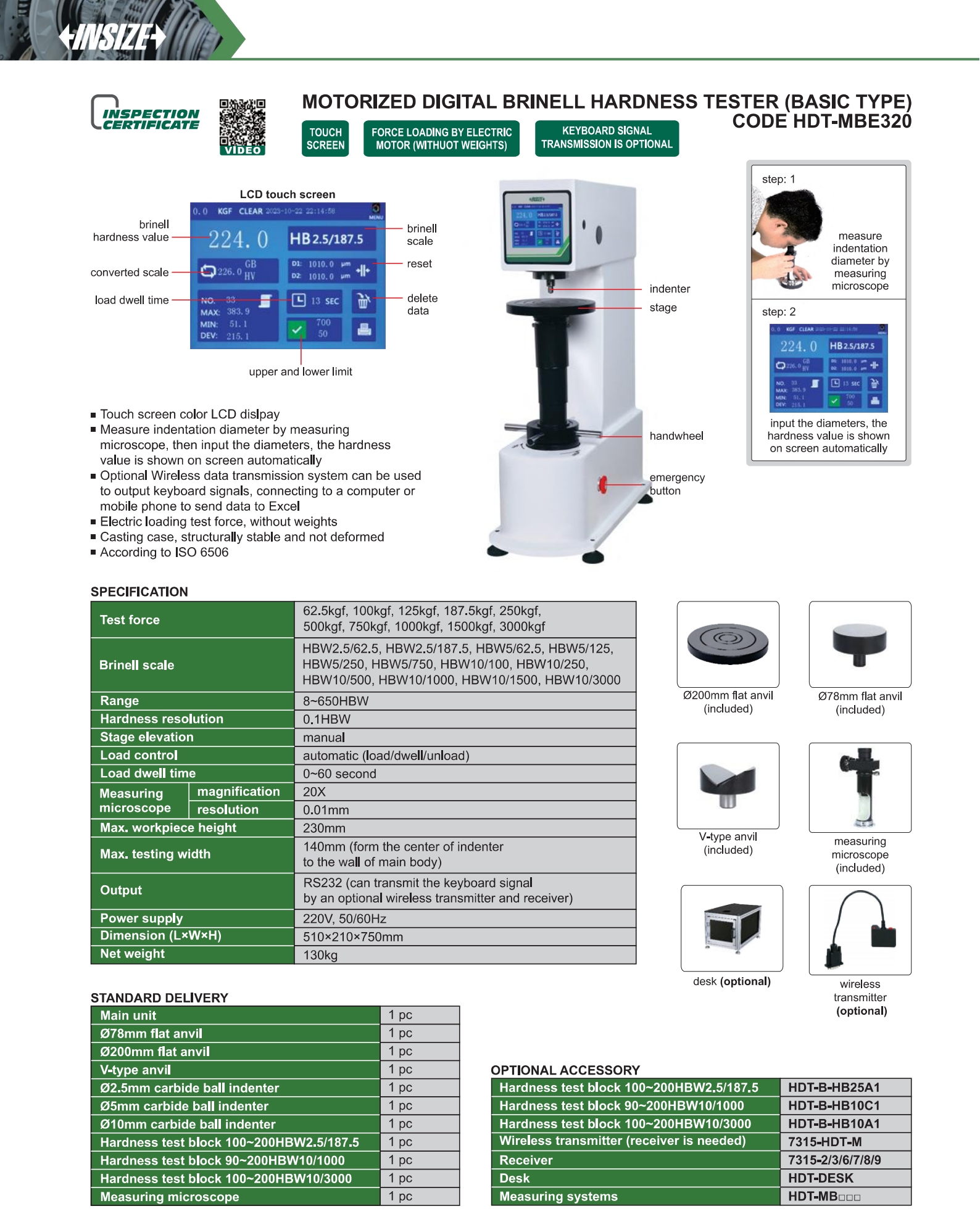 | HDT-MBE320 | 62.5kgf, 100kgf, 125kgf, 187.5kgf, 250kgf, 500kgf, 750kgf, 1000kgf, 1500kgf, 3000kgf | automatic (load/dwell/unload) | 230mm | 140mm (form the center of indenter to the wall of main body) | HBW2.5/62.5, HBW2.5/187.5, HBW5/62.5, HBW5/125, HBW5/250, HBW5/750, HBW10/100, HBW10/250, HBW10/500, HBW10/1000, HBW10/1500, HBW10/3000 |
