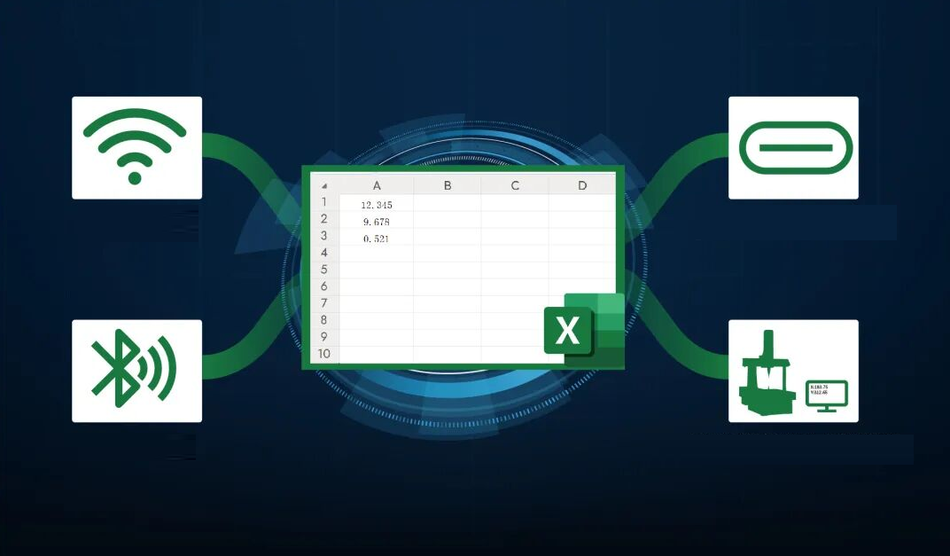 Measurement data is transmitted instantly from the gauge to a receiver via a wireless transmitter. The system supports multiple output formats such as keyboard and serial signals, allowing the data to be automatically entered into Excel reports, analysis software, or customer-specified systems.