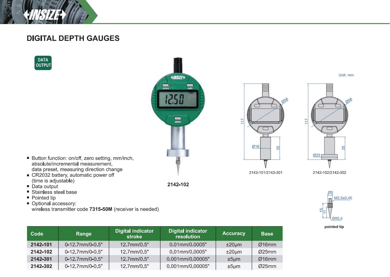 | 2142-101 | 0-12.7mm/0-0.5" | ±20µm | 0.01mm/0.0005" | with data interface |