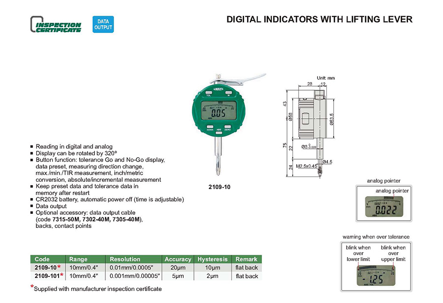 Button function: tolerance Go and No-Go display, data preset, measuring direction change, max./min./TIR measurement, inch/metric conversion,absolute/incremental measurement