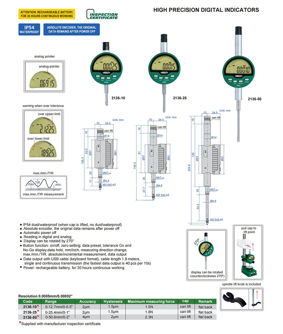 | 2136-10 | 0-12.7mm/0-0.5" | 2µm | 0.0005mm/0.00002" |