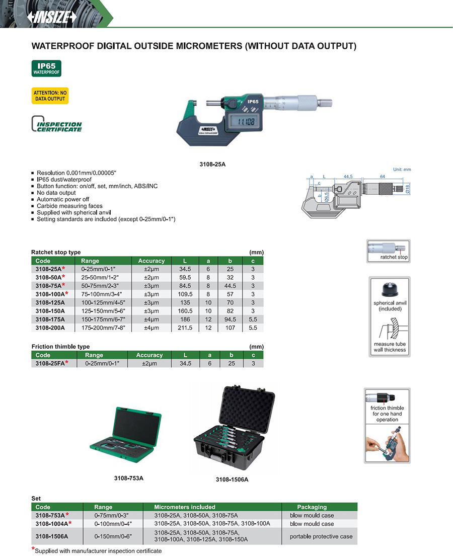 | 3108-25A | ratchet stop | 0-25mm/0-1" | ±2μm | 0.001mm/0.00005" |