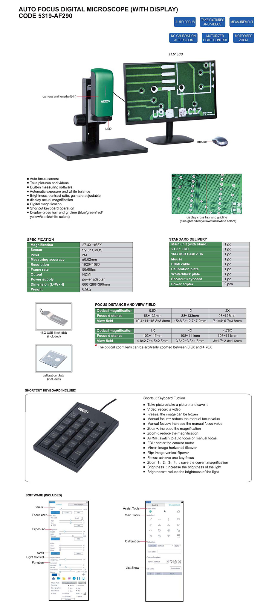 | 5319-AF290 | auto focus digital microscopes | 27.4X~163X | 19.4×11~15.8×8.8, 15×8.3~12.7×7.2, 7.1×4~6.7×3.8, 4.8×2.7~4.5×2.5, 3.6×2~3.3×1.8, 3×1.7~2.8×1.6 | 2M |