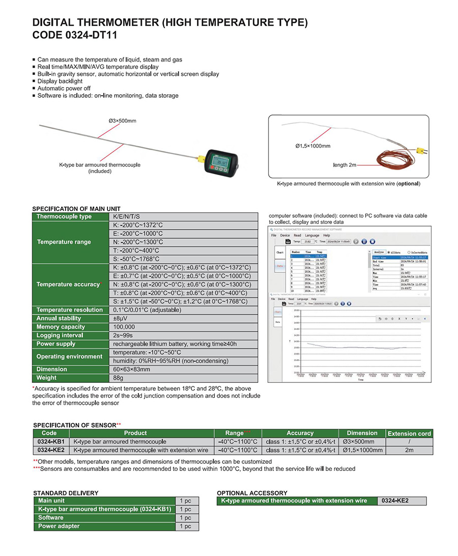 | 0324-DT11 | K | thermocouple | ±0.8°C (at -200°C~0°C); ±0.6°C (at 0°C~1372°C) | 1 | yes | -200°C~1372°C |