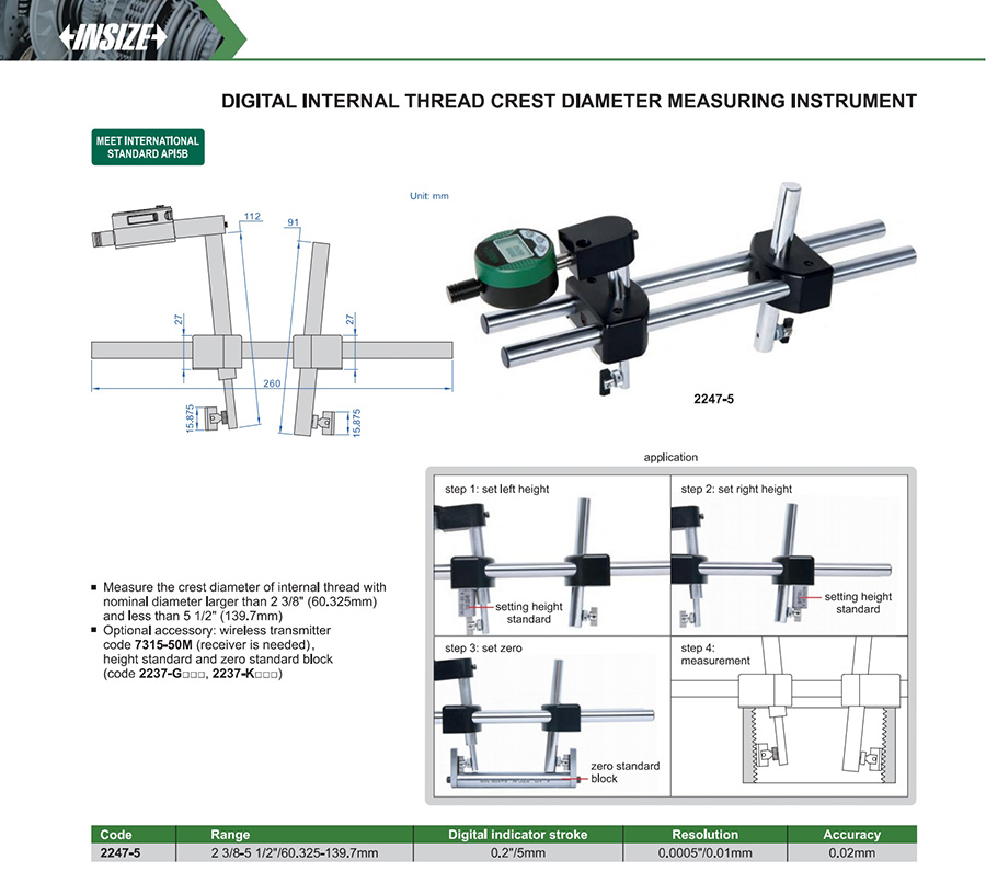| 2247-5 | 2 3/8-5 1/2"/60.325-139.7mm | 0.02mm | 0.0005"/0.01mm | crest diameter |