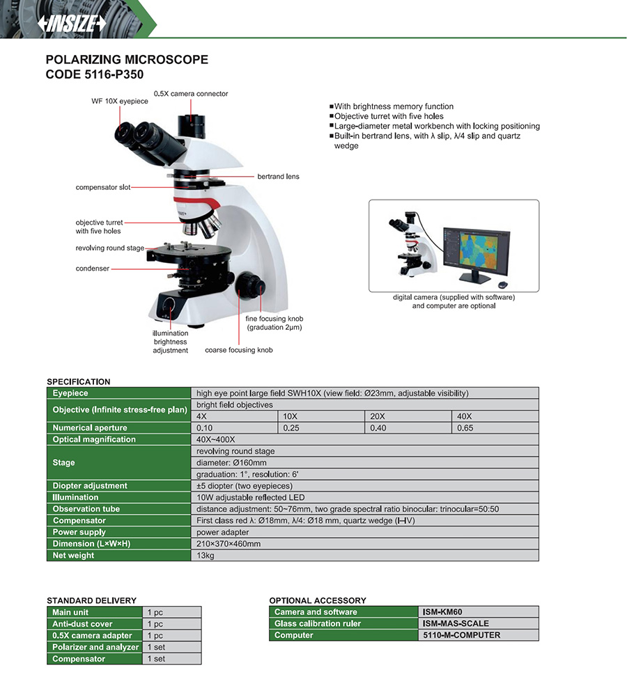 | 5116-P350 | diameter: Ø160mm,graduation: 1°, resolution: 6' | 40X~400X | high eye point large field SWH10X | bright field |
