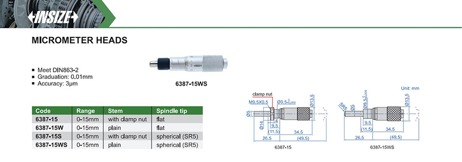 | 6387-15WS | 0-15mm | 3μm | 0.01mm | plain | spherical (SR5) |