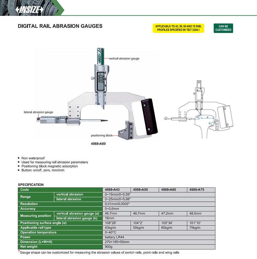 | 4988-A50 | vertical abrasion: 0~15mm/0~0.59", lateral abrasion: 0~25mm/0~0.98" | 0~0.6mm | 0.01mm/0.0005" |