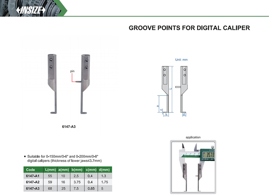 | 6147-A1 | suitable for 0-150mm/0-6" and 0-200mm/0-8" digital calipers (thickness of lower jaws≤3.7mm) |