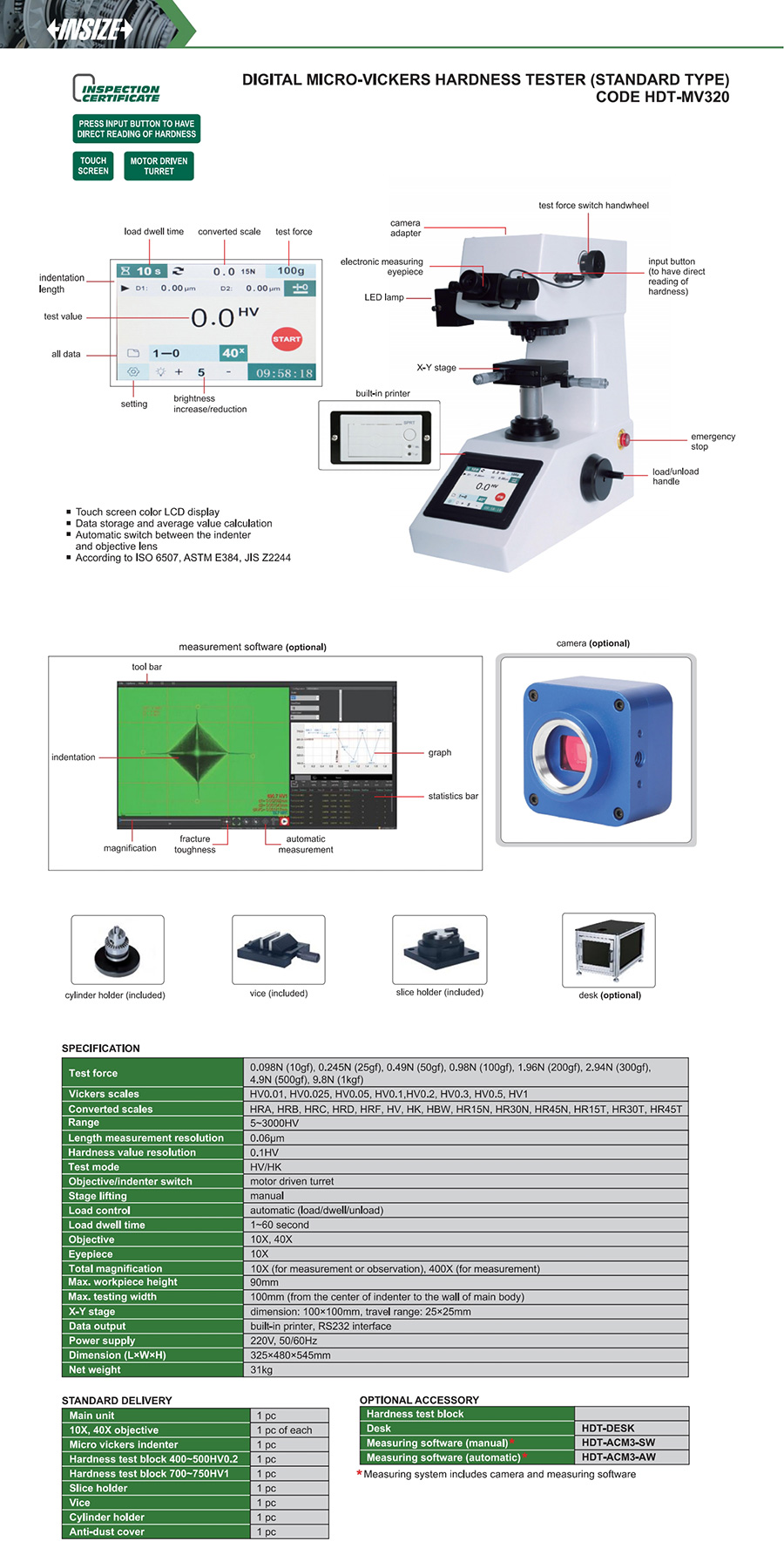 HDT-MV320 automatic (load/dwell/unload) 90mm 100mm HV0.01, HV0.025, HV0.05, HV0.1, HV0.2, HV0.3, HV0.5, HV1 10X (for measurement or observation), 400X (for measurement)