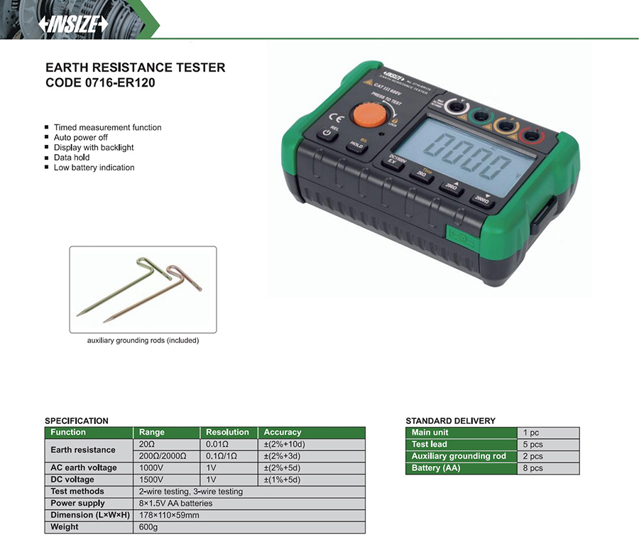 | 0716-ER120 | 20Ω/200Ω/2000Ω | 1000V | 1500V | 2-wire testing, 3-wire testing |