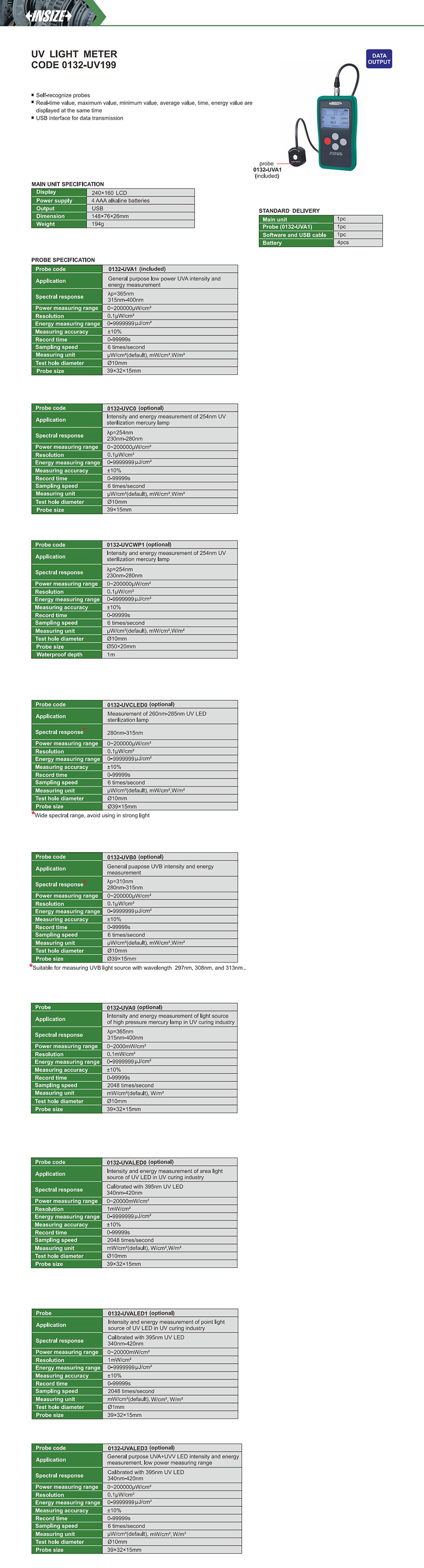 | 0132-UVA199 | general purpose low power UVA intensity and energy measurement | Power:0~200000µW/cm² | Test hole:Ø10mm | Probe:39×32×15mm |