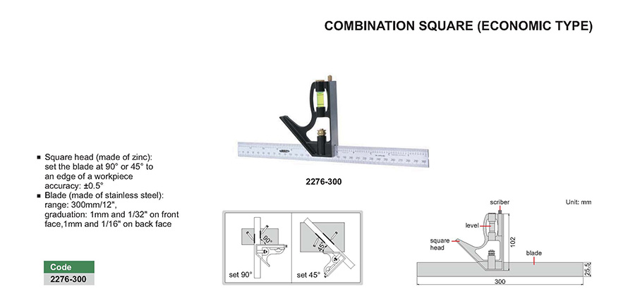 Square head (made of zinc): set the blade at 90° or 45° to an edge of a workpieceaccuracy: ±0.5°
