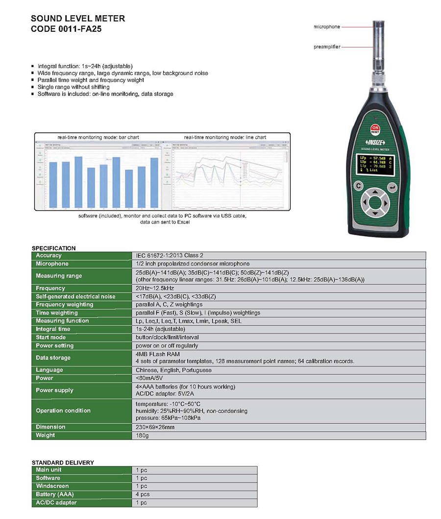 | 0011-FA25 | IEC 61672-1:2013 class 2 | 20Hz~12.5kHz | parallel A, C, Z weightings | yes |