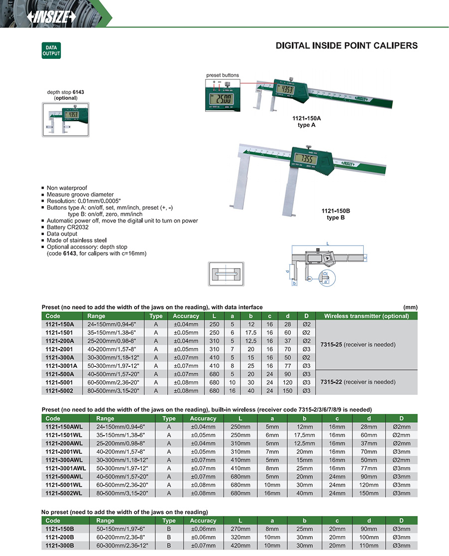 | 1121-2001 | A | 40-200mm/1.57-8" | ±0.05mm | 0.01mm/0.0005" | with data interface |