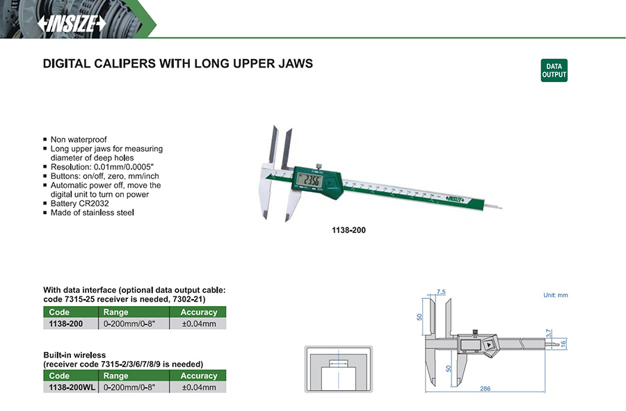 | 1138-200WL | 0-200mm/0-8" | ±0.04mm | 0.01mm/0.0005" | built-in wireless |