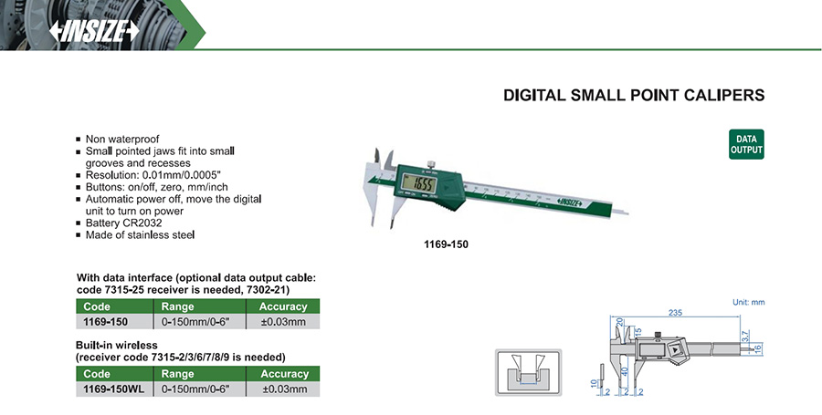 | 1169-150WL | 0-150mm/0-6" | ±0.03mm | 0.01mm/0.0005" | built-in wireless |