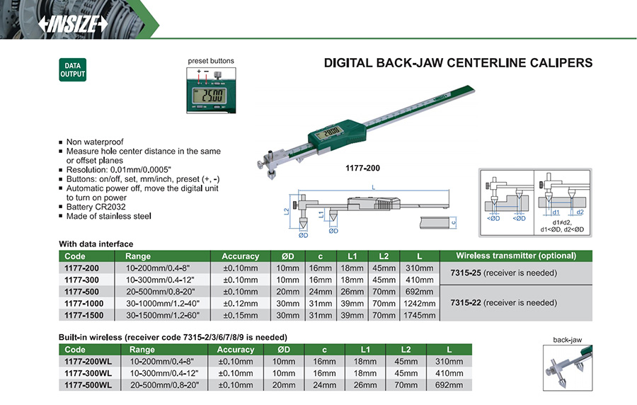 | 1177-200WL | 10-200mm/0.4-8" | ±0.10mm | 0.01mm/0.0005" | built-in wireless |