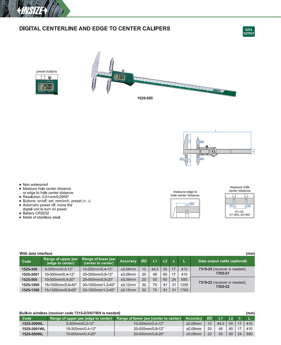 | 1525-3001 | edge to center: 10-300mm/0.4-12" | center to center: 20-300mm/0.8-12" | ±0.08mm | 0.01mm/0.0005" | with data interface |