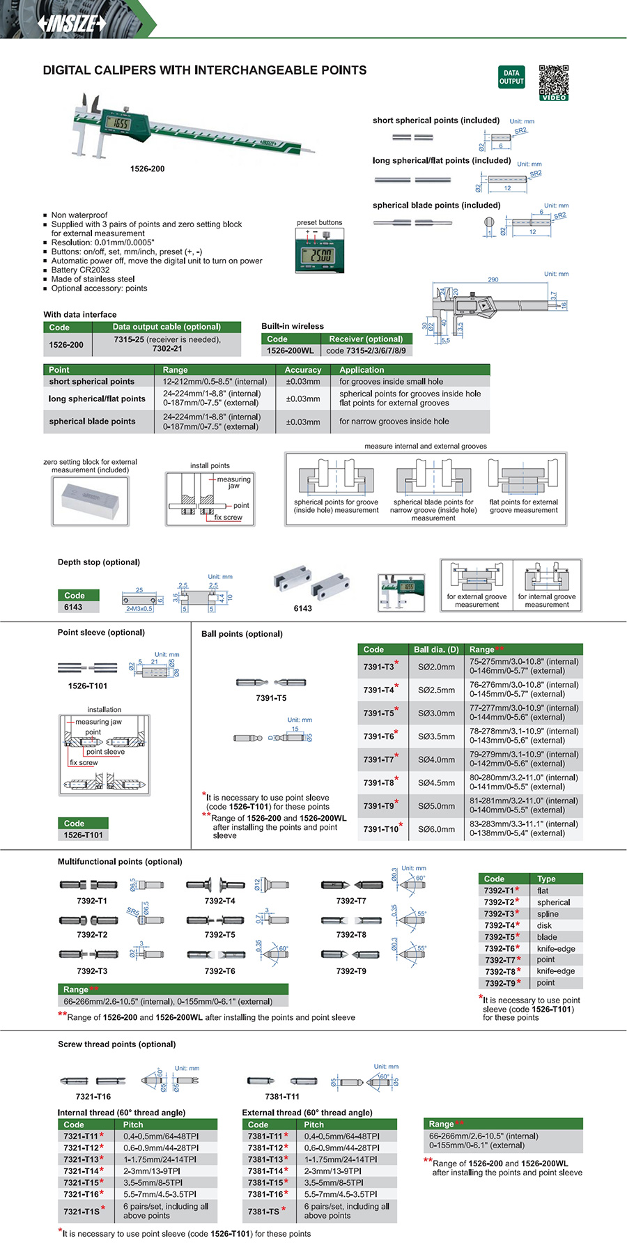 | 1526-200 | 24-224mm (internal), 0-187mm (external) | ±0.03mm | 0.01mm/0.0005" | with data interface | spherical blade points |