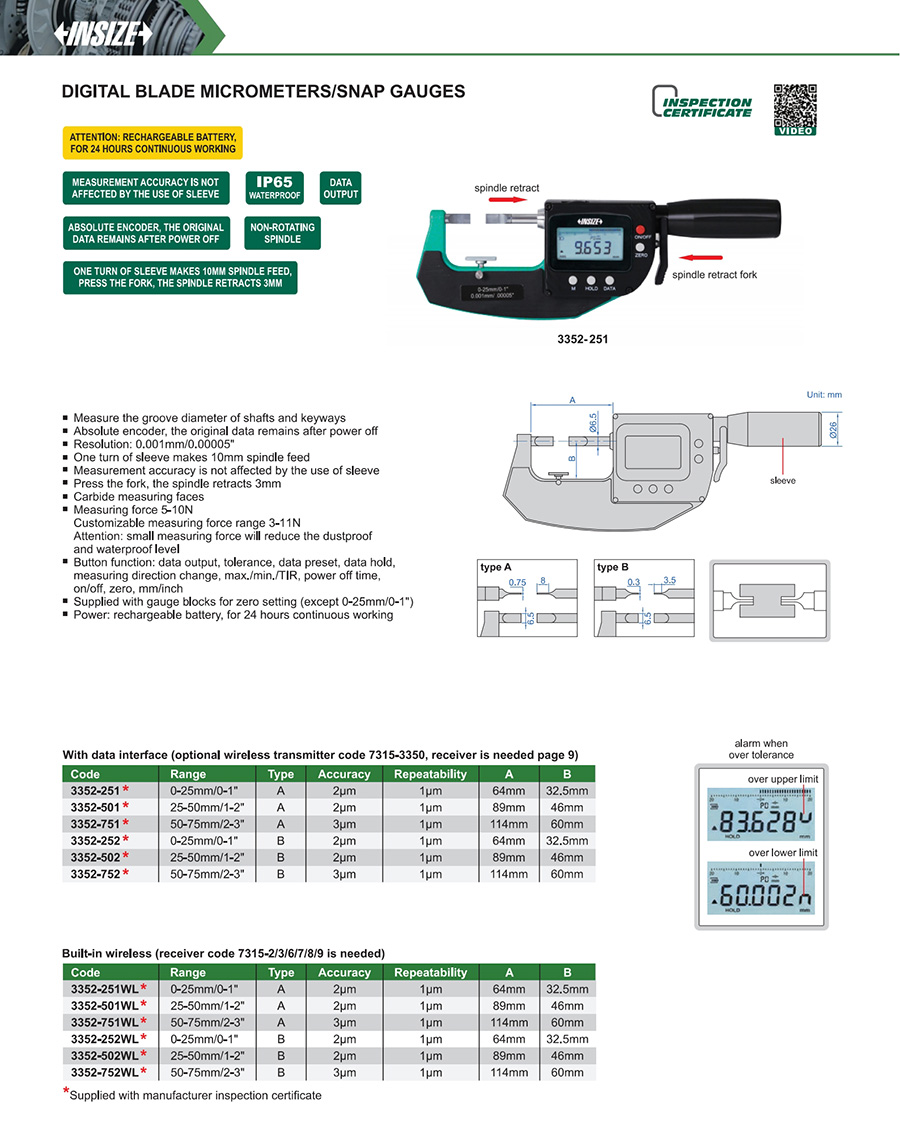 | 3352-251WL | A | 0-25mm/0-1" | 2μm | 0.001mm/0.00005" | built-in wireless |