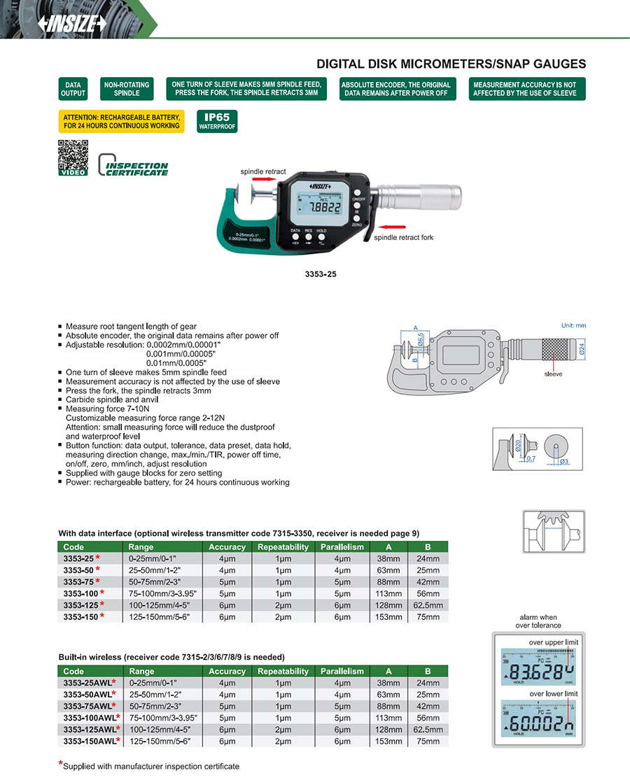 | 3353-25AWL | 0-25mm/0-1" | 4µm | 0.0002mm/0.00001", 0.001mm/0.00005", 0.01mm/0.0005" | built-in wireless |