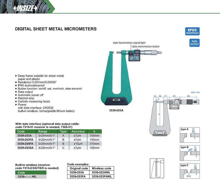 | 3539-253SA | C | 0-25mm/0-1" | ±7μm | 0.001mm/0.00005" | with data interface |