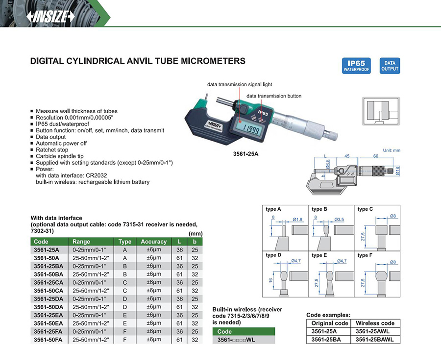 | 3561-25FAWL | F | 0-25mm/0-1" | ±6μm | 0.001mm/0.00005" | built-in wireless |