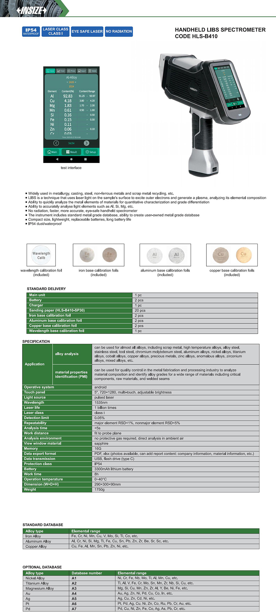 The instrument includes standard metal grade database, ability to create user-owned metal grade database