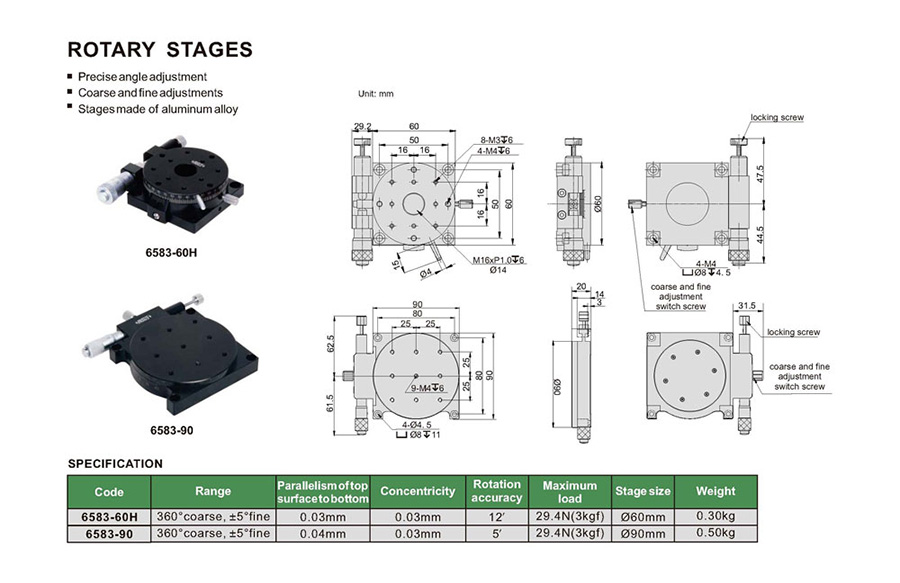 | 6583-90 | 360° coarse, ±5° fine | 0.04mm | Ø90mm |