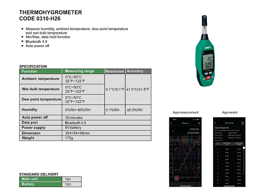 | 0310-H26 | digital | external | ±1.0°C/±1.8°F | 0%RH~80%RH | ±5.0%RH | yes | yes | 0°C~50°C/32°F~122°F |