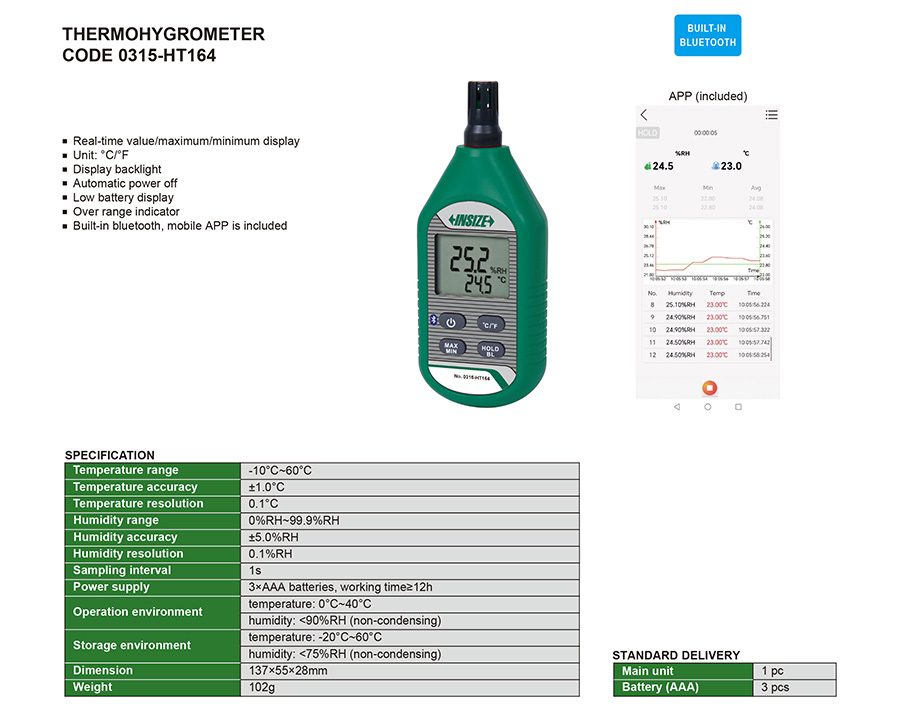 | 0315-HT164 | digital | external | ±1.0°C | 0%RH~99.9%RH | ±5.0%RH | yes | -10°C~60°C |