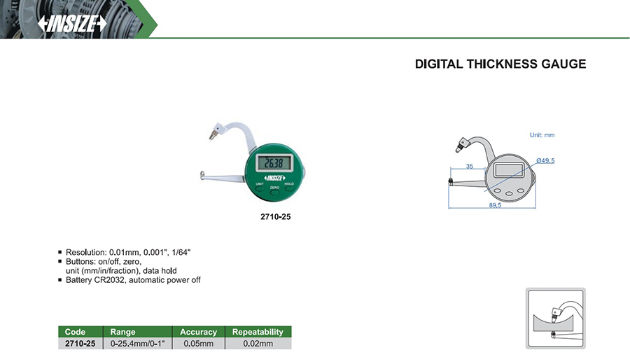 Buttons: on/off, zero, unit (mm/in/fraction), data hold