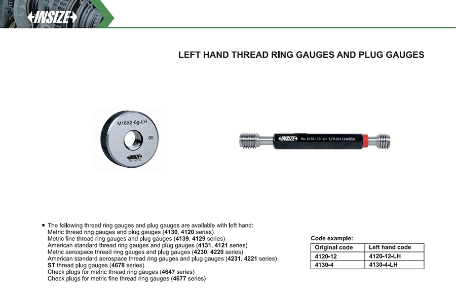 The following thread ring gauges and plug gauges are available with left hand: Metric thread ring gauges and plug gauges (4130, 4120 series), Metric fine thread ring gauges and plug gauges (4139, 4129 series), American standard thread ring gauges and plug gauges (4131, 4121 series), Metric aerospace thread ring gauges and plug gauges (4230, 4220 series), American standard aerospace thread ring gauges and plug gauges (4231, 4221 series), ST thread plug gauges (4678 series), Check plugs for metric thread ring gauges (4647 series), Check plugs for metric fine thread ring gauges (4677 series)