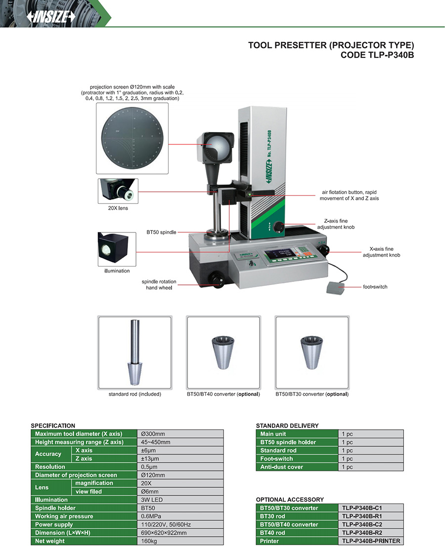 | TLP-P340B | 0.5μm | Ø300mm | 45~450mm | ±6μm | ±13μm |