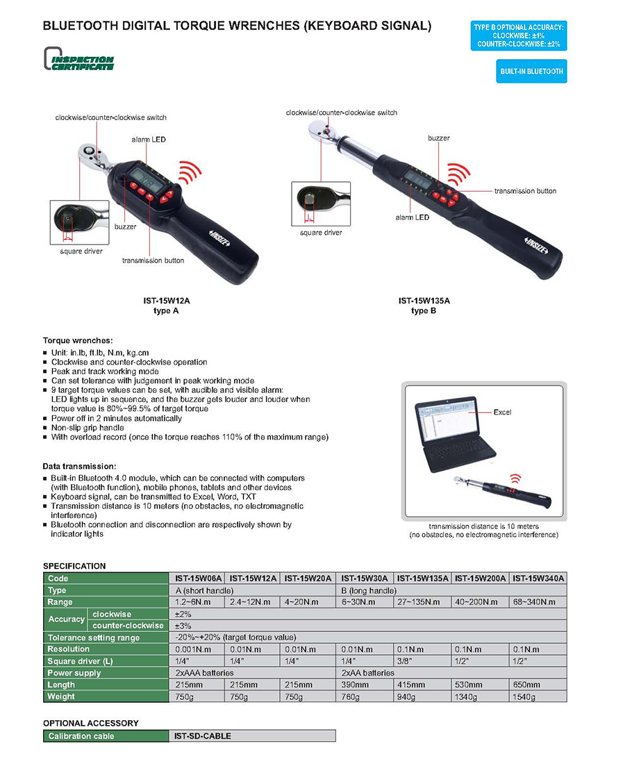 | IST-15W340A | digital | 68~340N.m | wireless transmission (keyboard signal) | digital display | fixed ratchet head |
