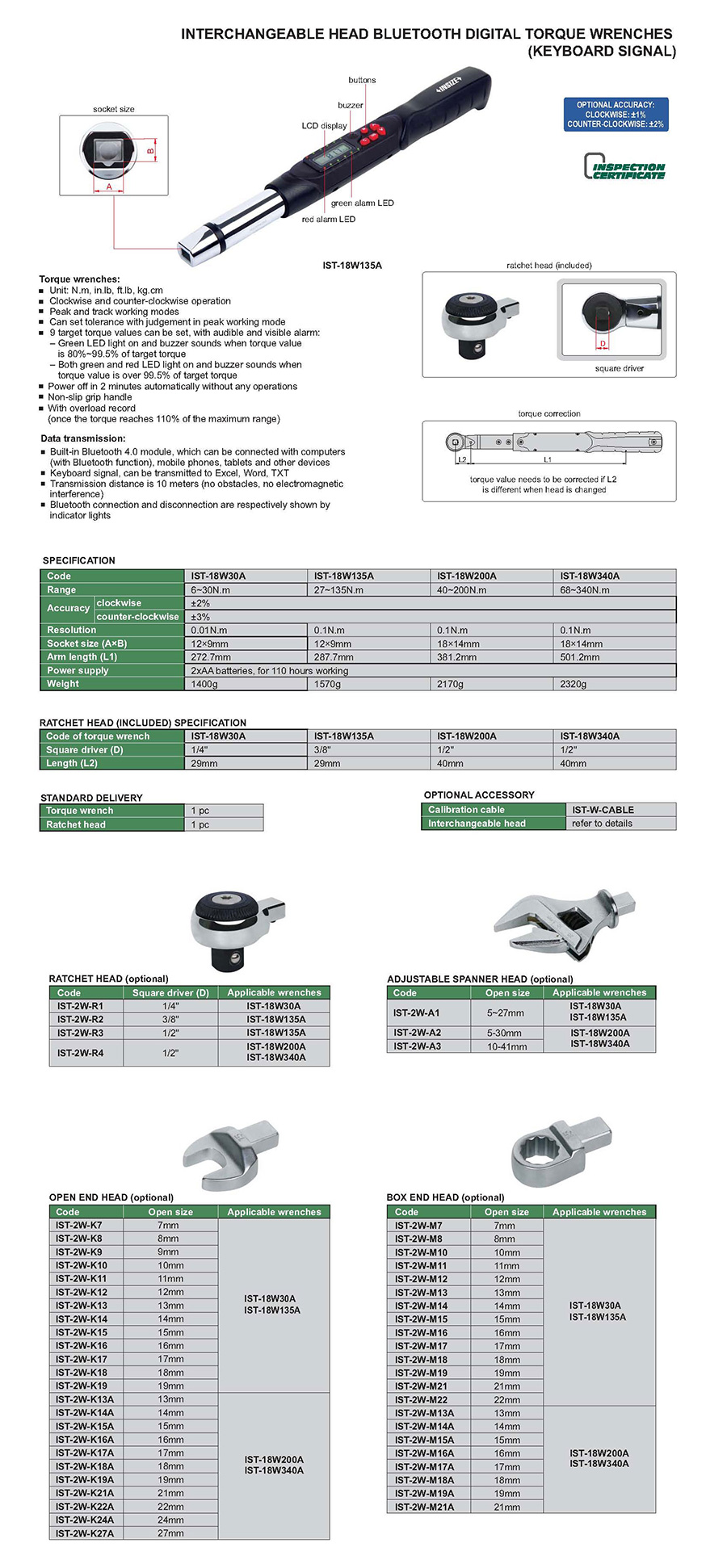| IST-18W135A | digital | 27~135N.m | wireless transmission (keyboard signal) | digital display | interchangeable head |