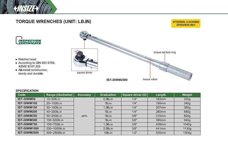 | IST-30WM500 | mechanical preset | 100~500lb.in | engraved-line | fixed ratchet head |