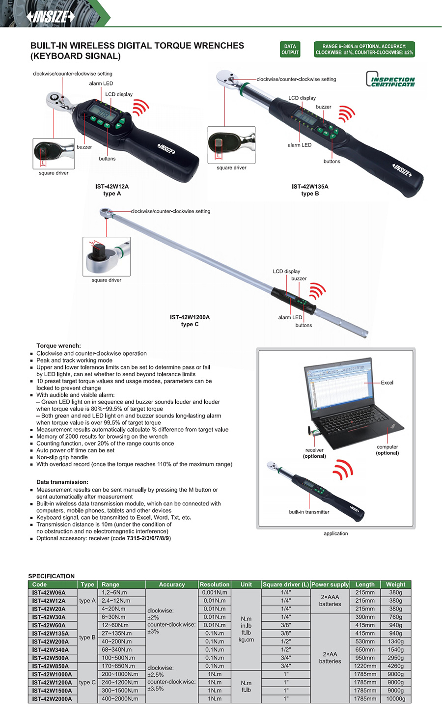 | IST-42W1200A | digital | 240~1200N.m | wireless transmission (keyboard signal) | digital display | fixed ratchet head |