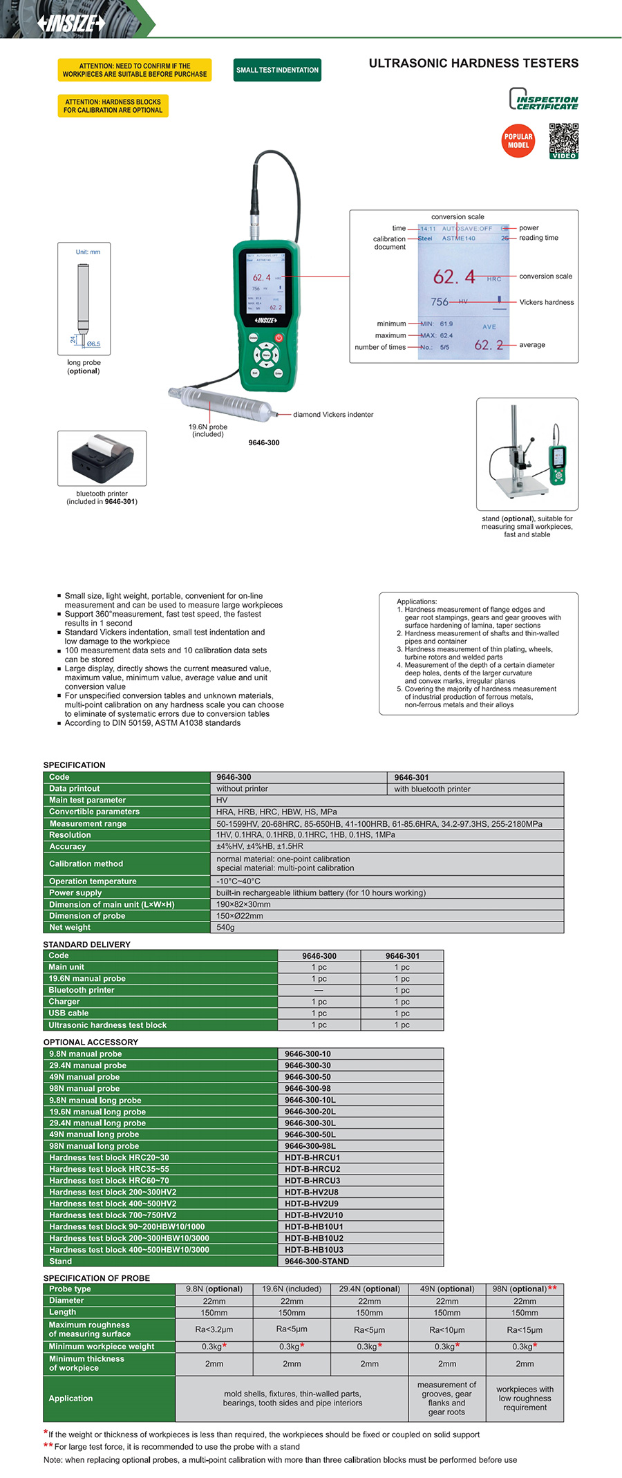 | 9646-301 | 50-1599HV, 20-68HRC, 85-650HB, 41-100HRB, 61-85.6HRA, 34.2-97.3HS, 255-2181MPa | HRA, HRB, HRC, HBW, HS, Mpa | with bluetooth printer |